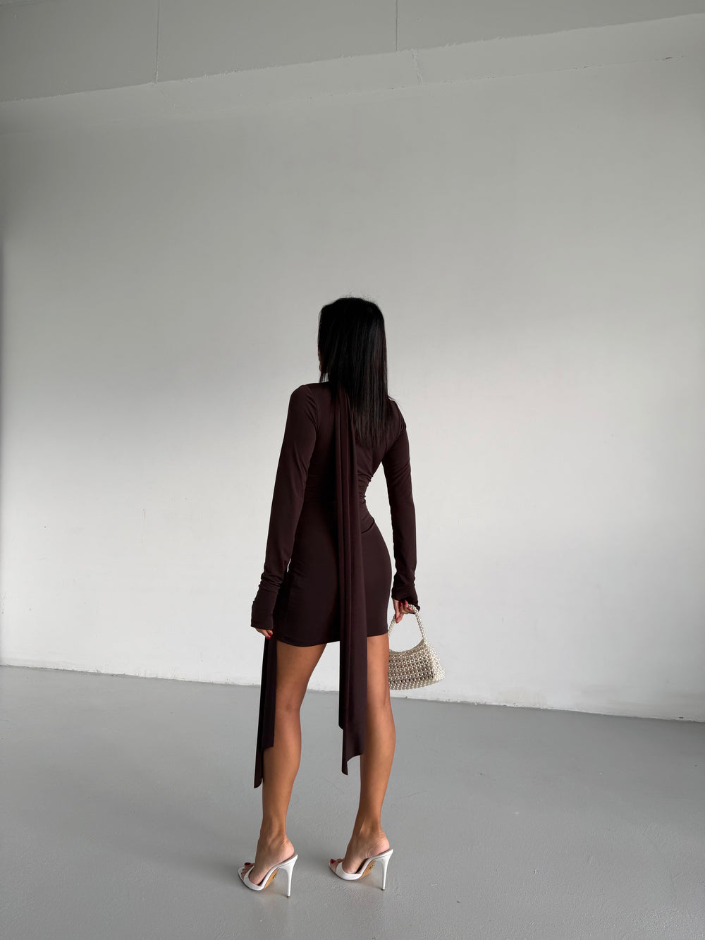 Vücudu saran özel kalıbı ve şık boyun detayından uzanan akıcı şalıyla bu elbise, gecenin tüm bakışlarını üzerinde toplar.
