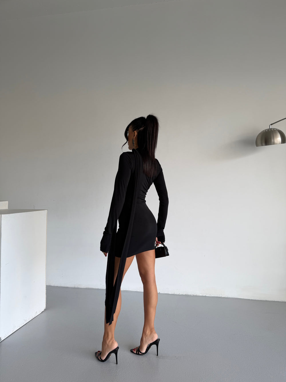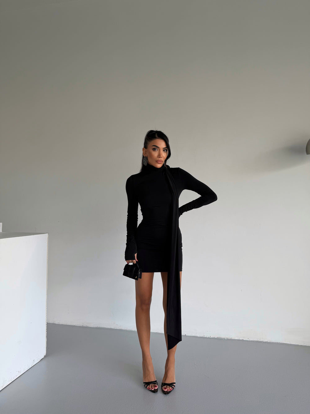 Vücudu saran özel kalıbı ve şık boyun detayından uzanan akıcı şalıyla bu elbise, gecenin tüm bakışlarını üzerinde toplar.